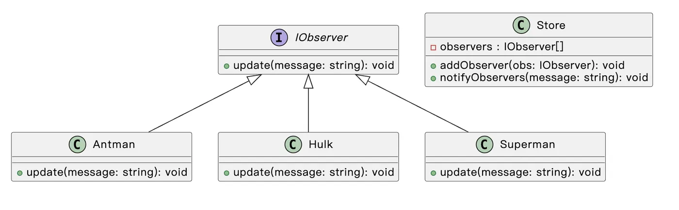 IObserver<T>:观察者必须实现的约束(必须有update)Store<T>:被观察者,内部维护observers列表,支持subscribe/unsubscribe/notify